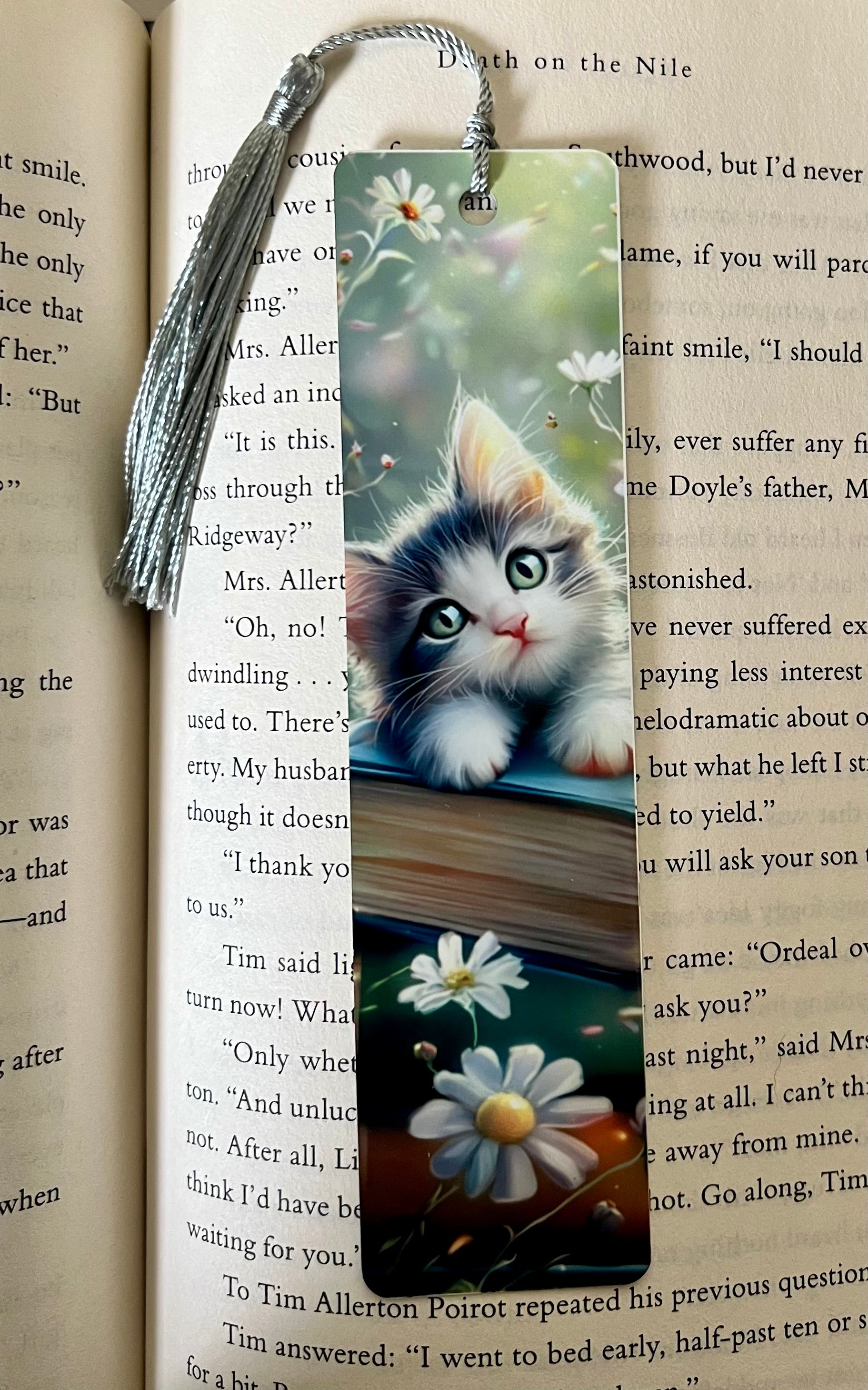 Bookmark - Metal Bookmark 1.5" x 6" with Tassel -Gray and White Kitten