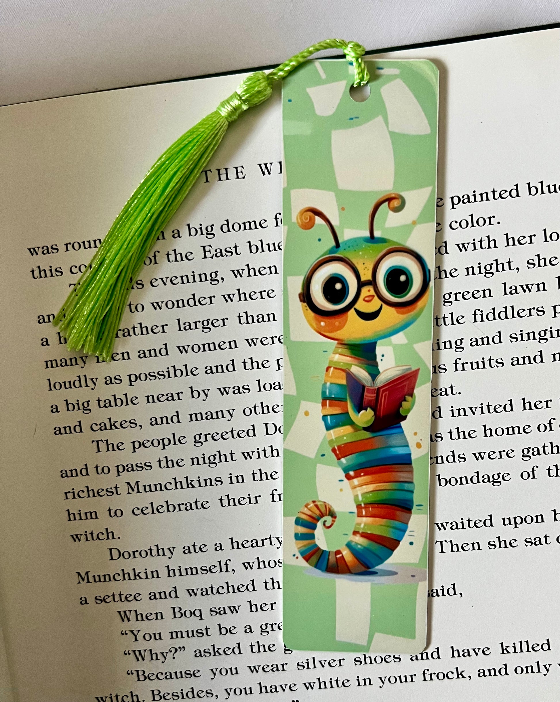 Bookmark - Metal Bookmark 1.5" x 6" with Tassel - Green Bookworm