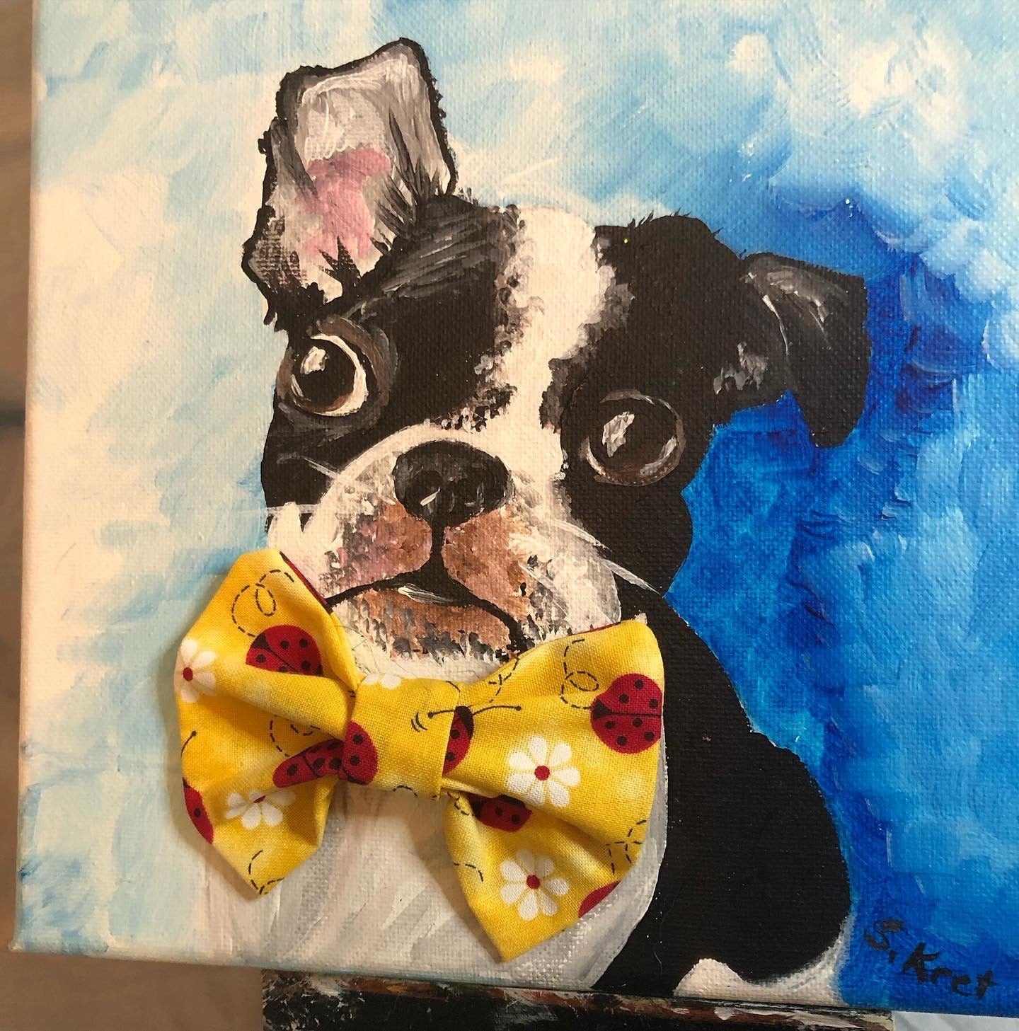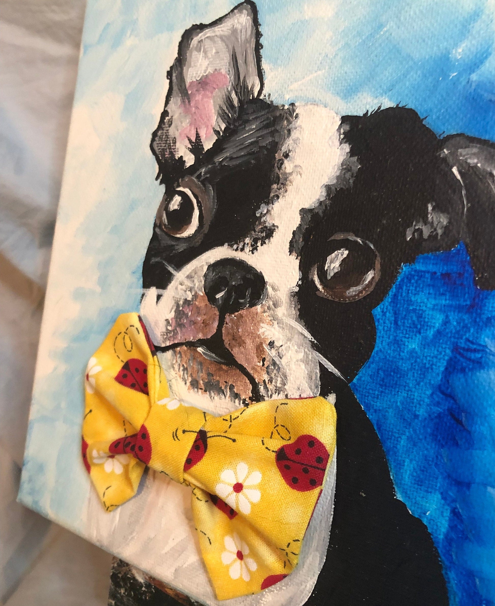 Handpainted, original acrylic painting. Stretched canvas, not canvas board. Adorable Boston Terrier with handmade bowtie attached to the painting.
