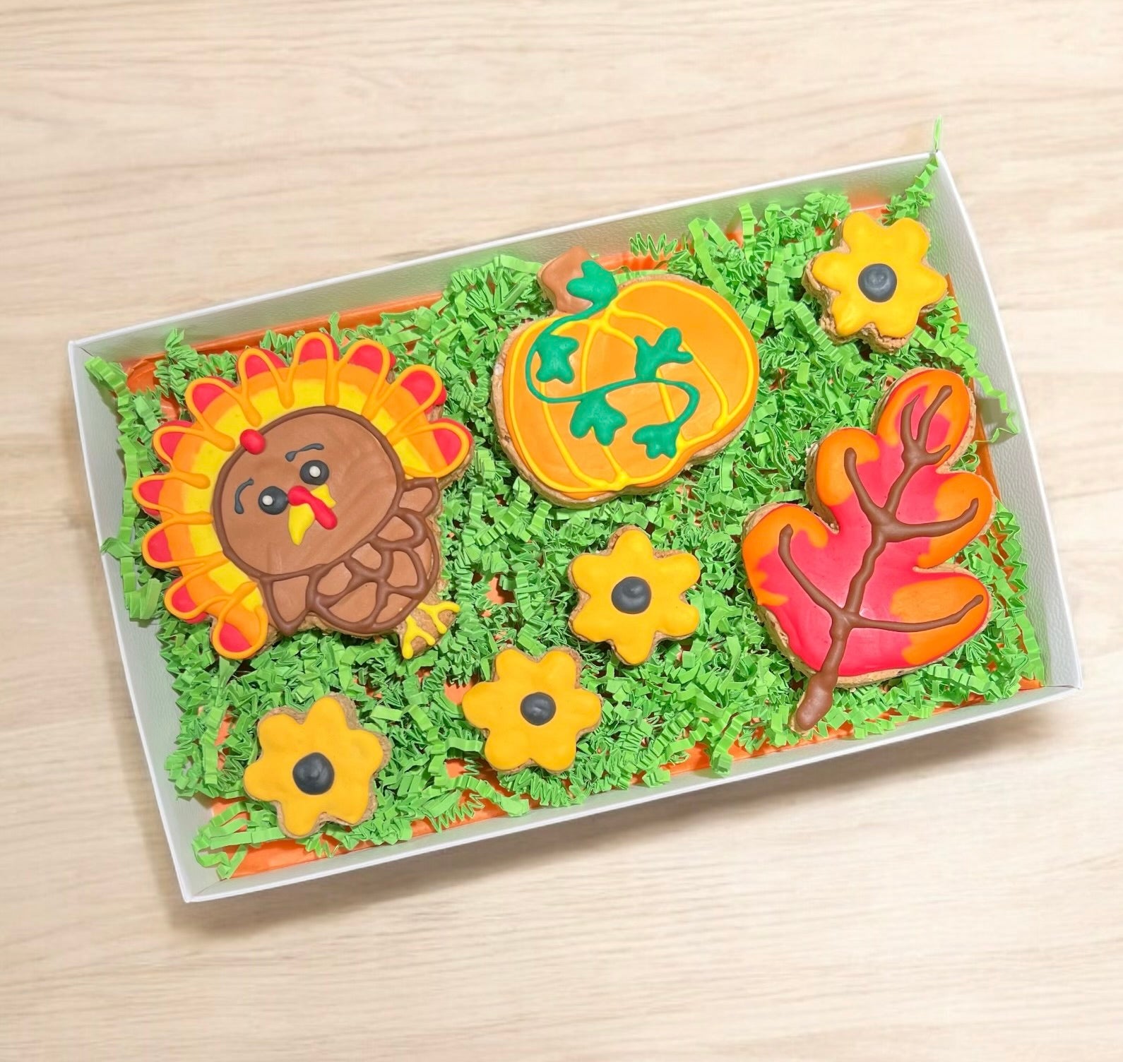 Introducing our Frosted Dog Treats Box - Turkey Time Theme! Made from the finest human-grade ingredients, this special seasonal box is adorned with an oak leaf, pumpkin, and the star of the show, Mr. Turkey; surrounded by beautiful fall flowers.