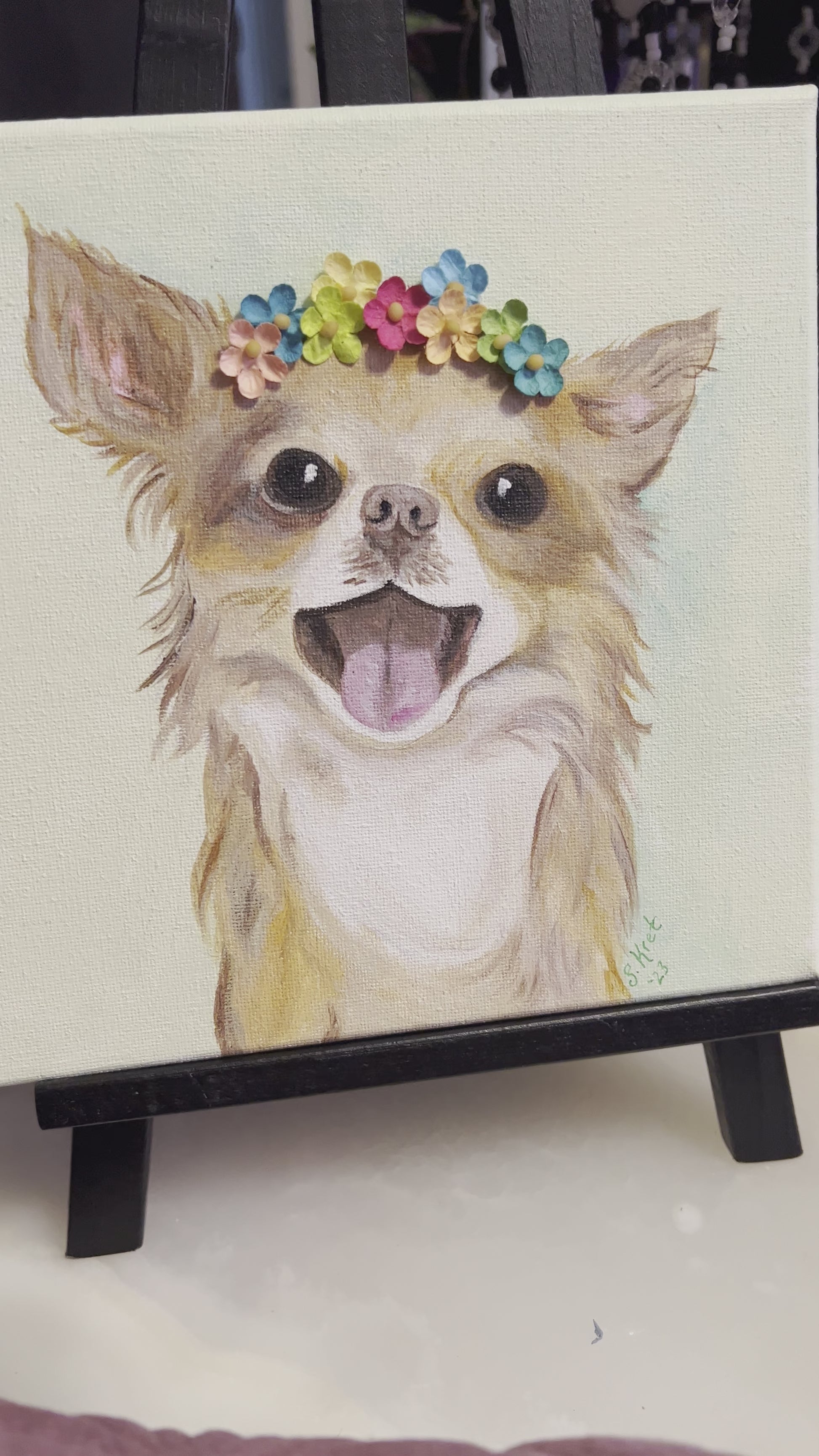 Original Acrylic Chihuahua Painting, Long Hair Chihuahua, Flower Headband