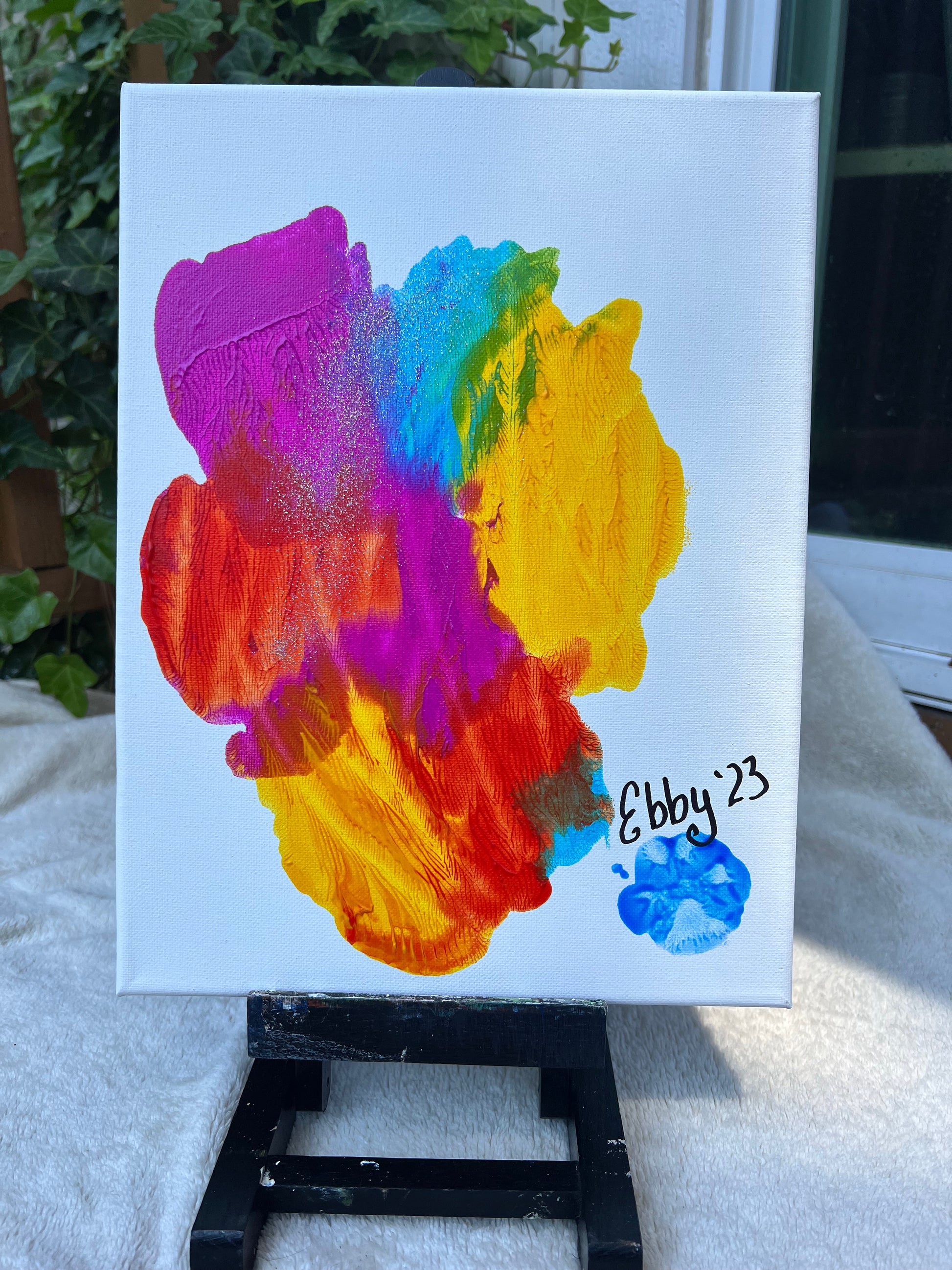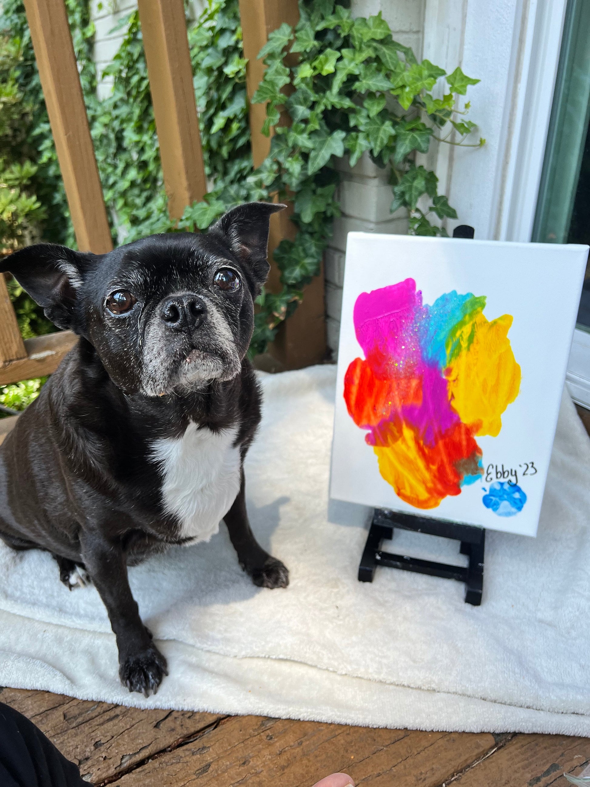 Each painting is done in acrylic paint on 11"x9" wrapped canvas, signed by Ebby (with non-toxic finger paint) and then her assistant sprinkles them with just a little fairy dust. The proceeds from Ebby's paintings go to help pay for her treatments along with food, meds and vet appointments for her and her 3 other rescue siblings.