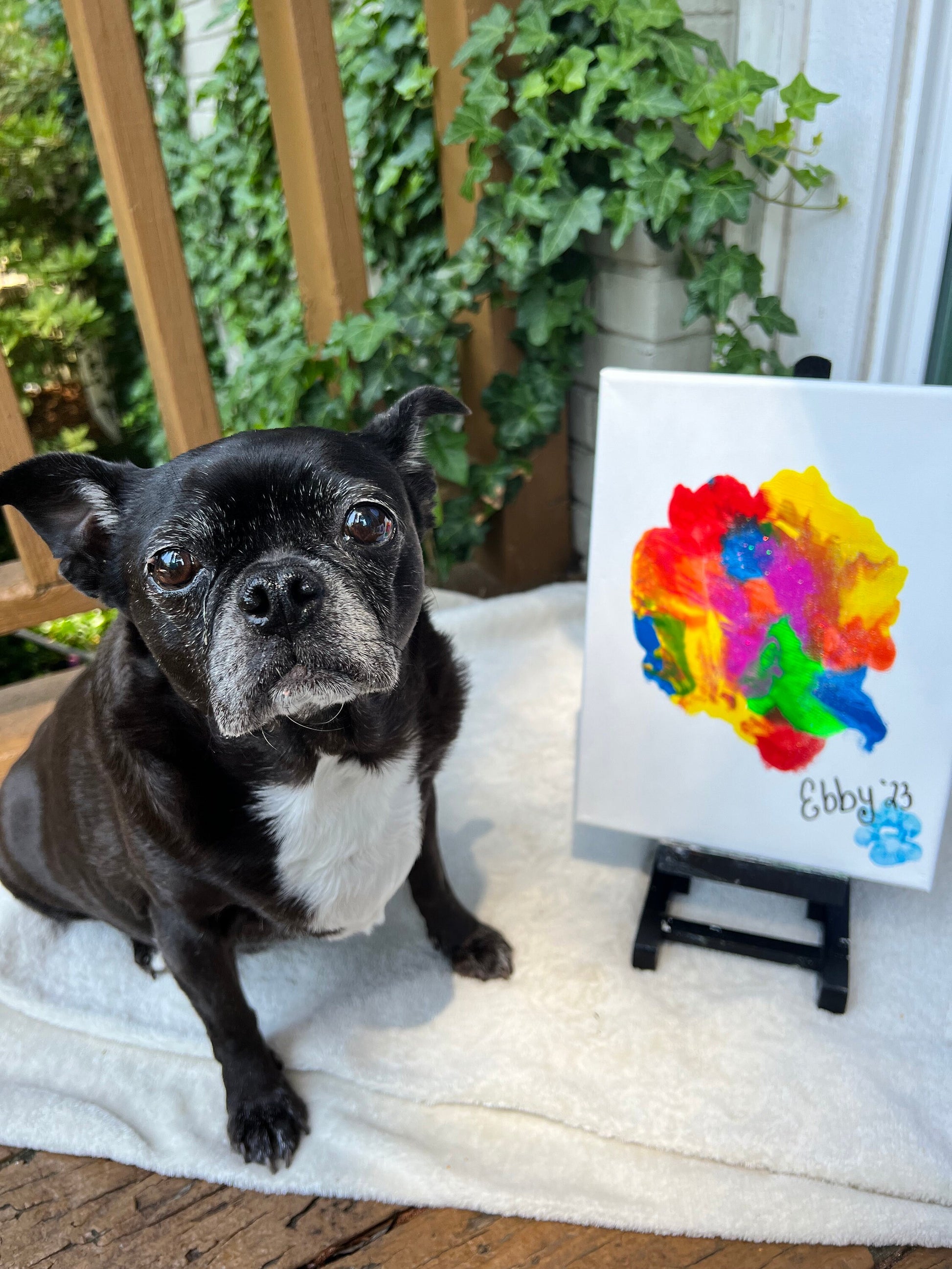 Ebby the Bugg (Boston Terrier, Pug mix) was rescued after her owner (and new mama's friend) died. It was then discovered that she has late stage 3 kidney disease. Ebby receives a sub-cutaneous treatment every day to help flush her kidneys and is on a lower protein diet to help her lose a little weight (she came extremely overweight) and to give her kidneys a bit of a break in processing that protein. She is the sweetest girl ever but sadly, her kidney disease is not reversible and her time left on this earth is limited. So at the suggestion of a friend, we decided to see how Ebby would do with painting. She LOVES it!