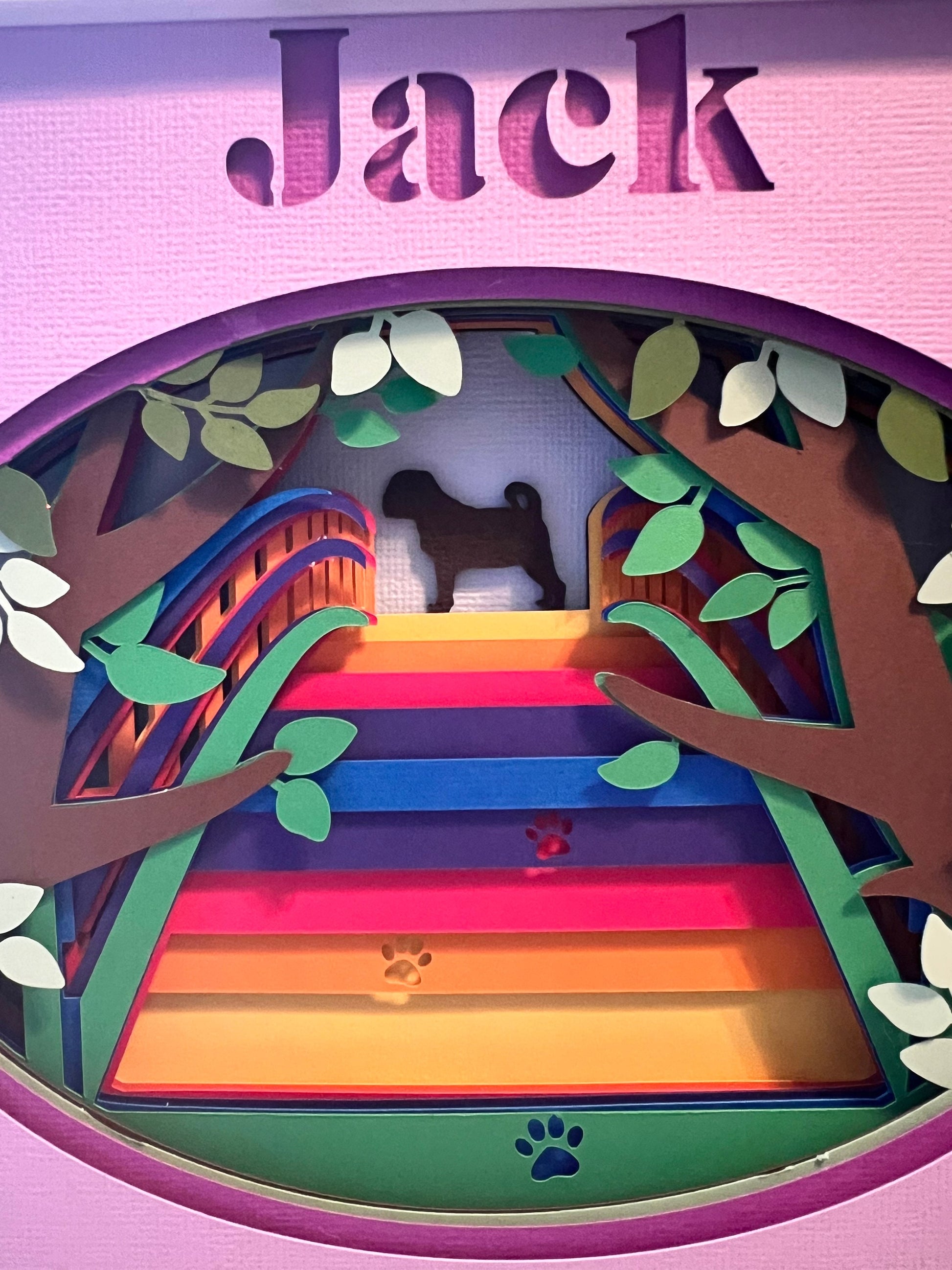 What better way to memorialize a beloved pet than a silhouette of him or her standing on the Rainbow Bridge?