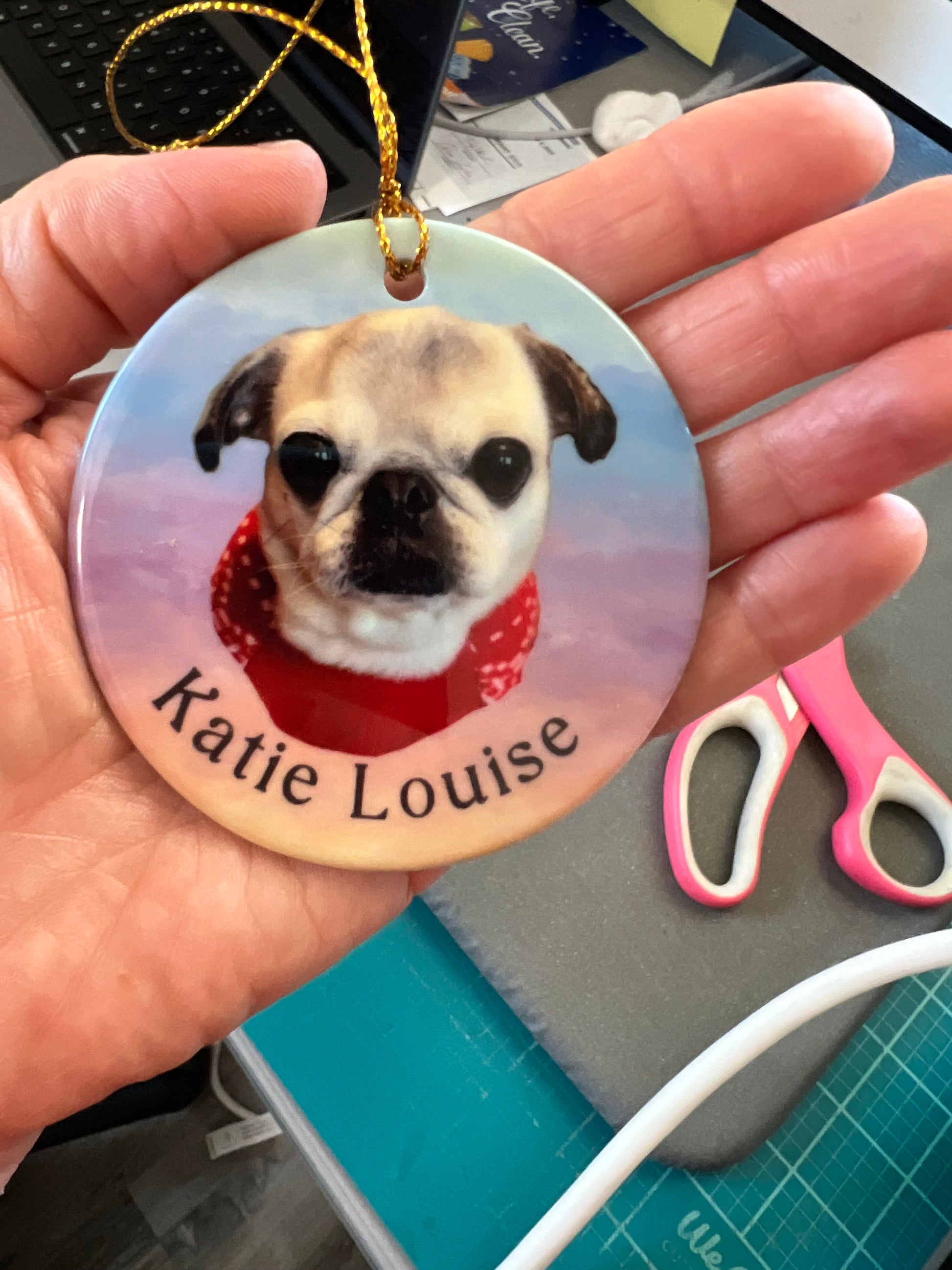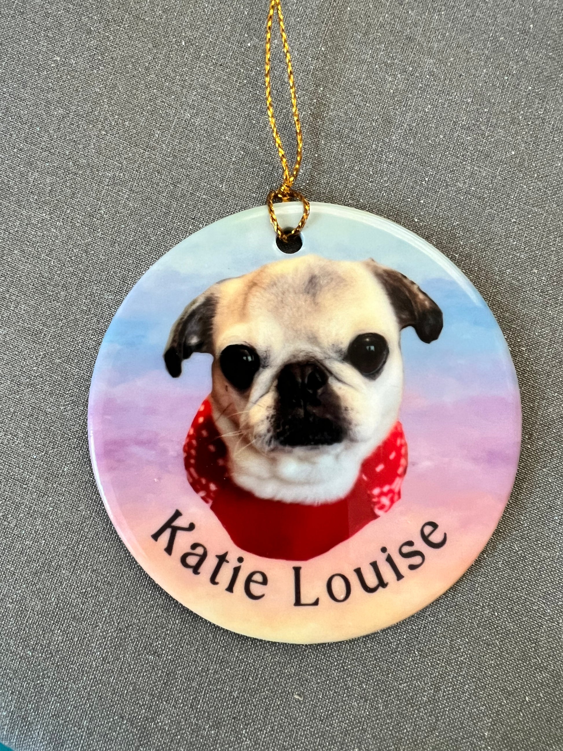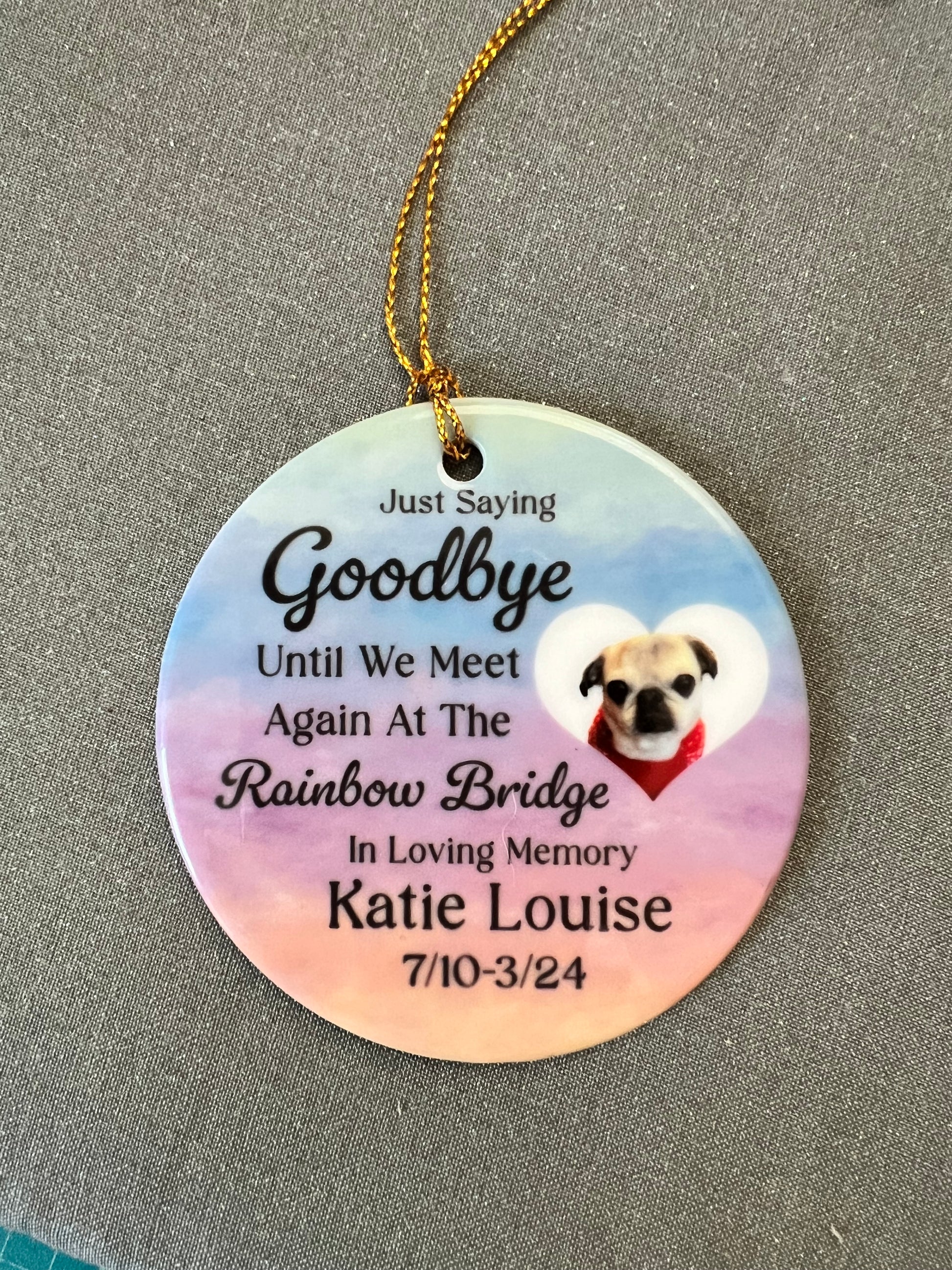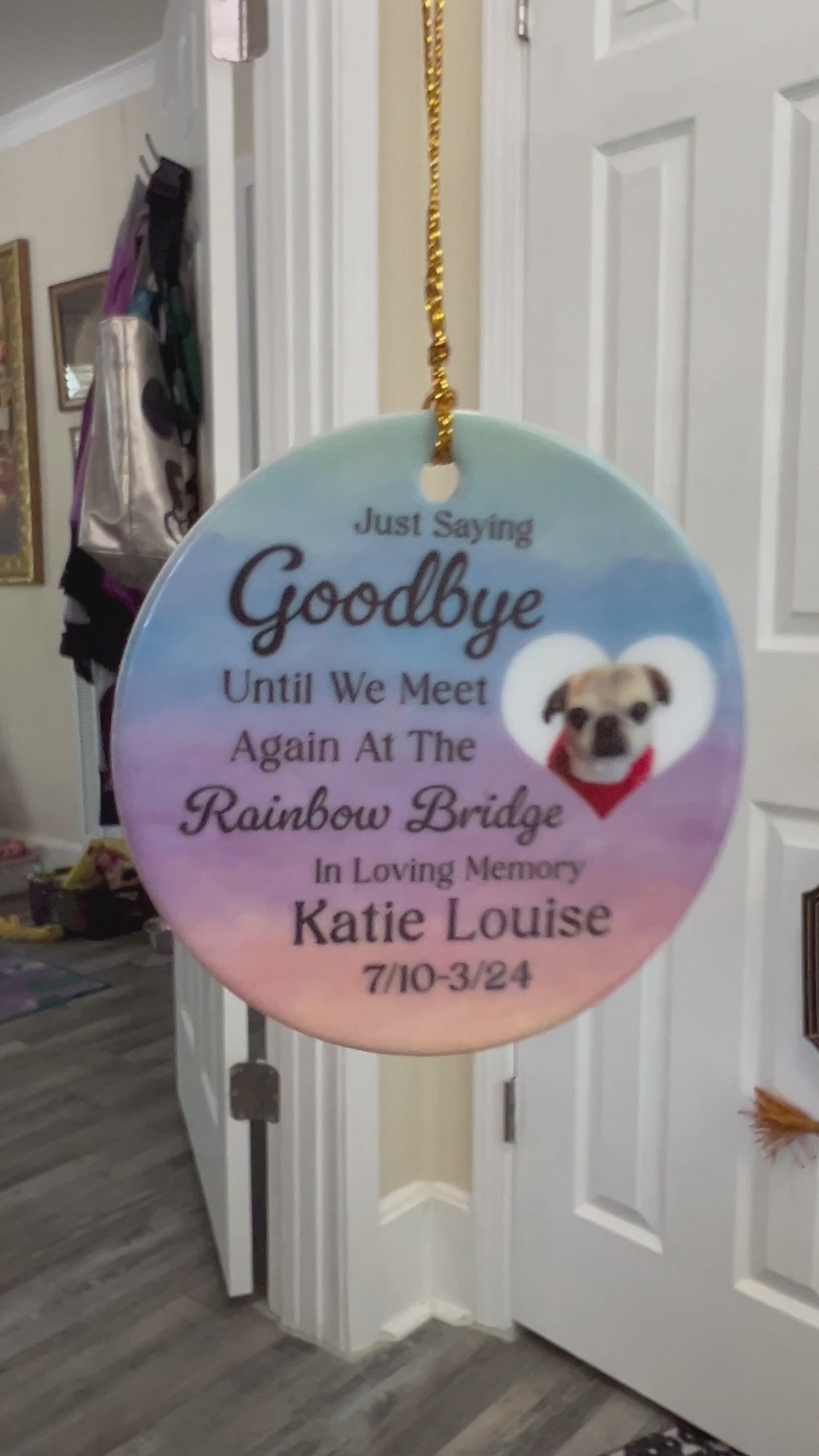 Memorialize your furbaby with this 2.75" round ceramic medallion. Front is a photo of your pupper (or kitty) with their name. The back says "Just saying goodbye until we meet again at the rainbow bridge. In loving memory (pet's name and dates) you can leave off the dates if you don't know or want them. Tied with golden string.