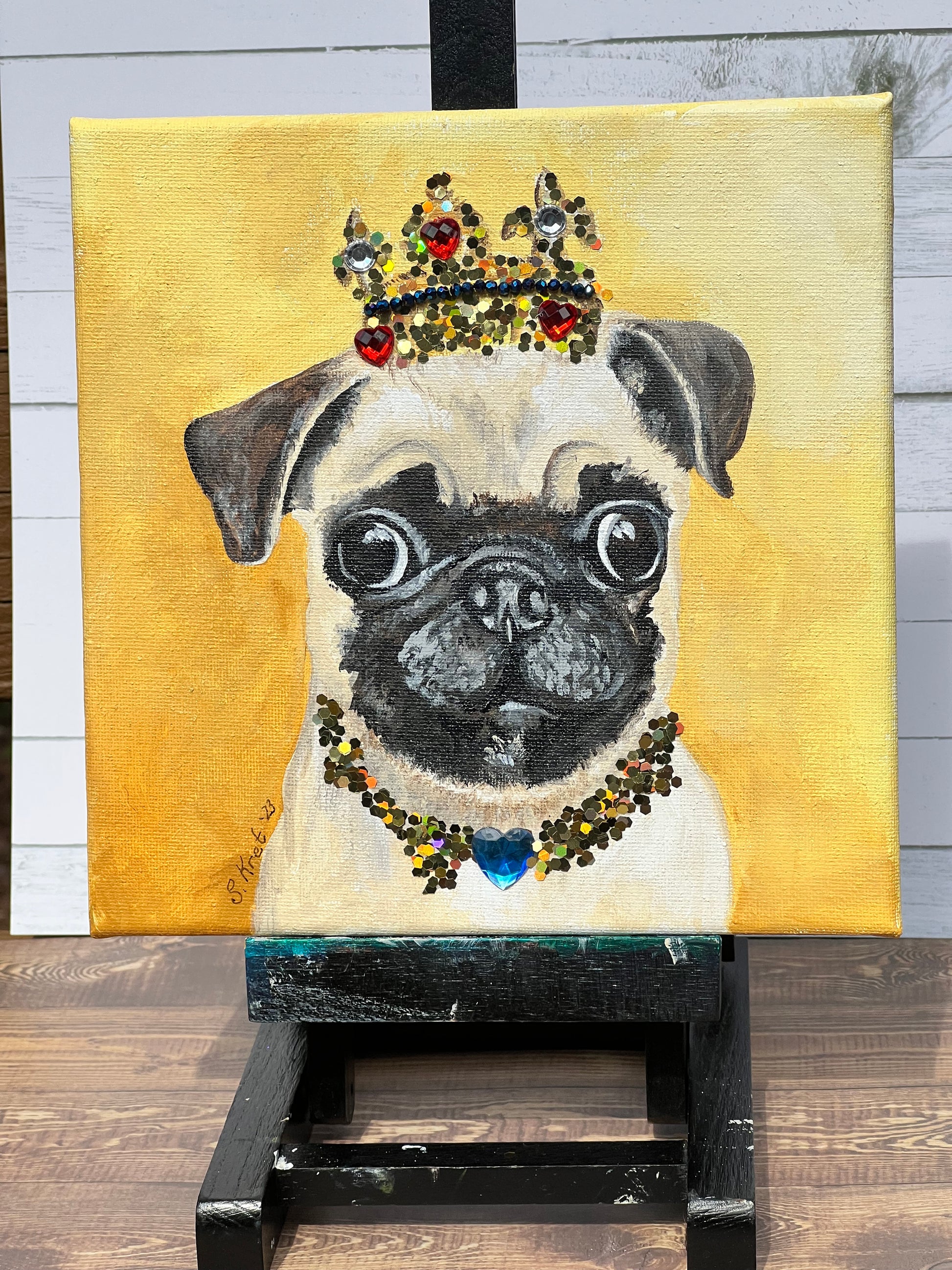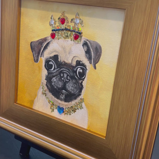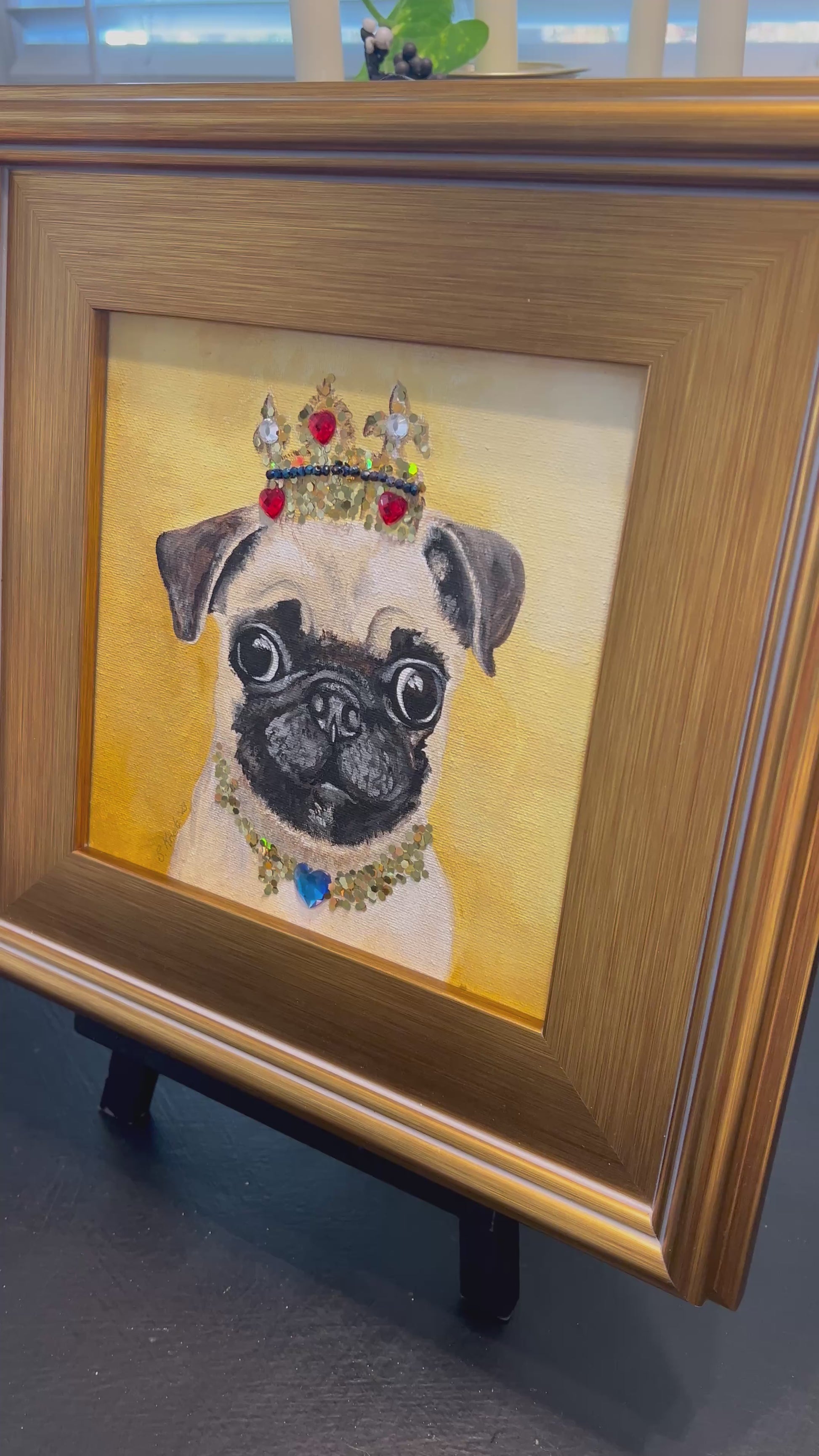 This striking one of a kind acrylic painting of a regal pug pup will make you feel like royalty! Featuring a prince or princess pug with a glittery crown and jewel necklace, it will be sure to crown your space with an air of royalty. Let this pup take your home decor game to the next level!