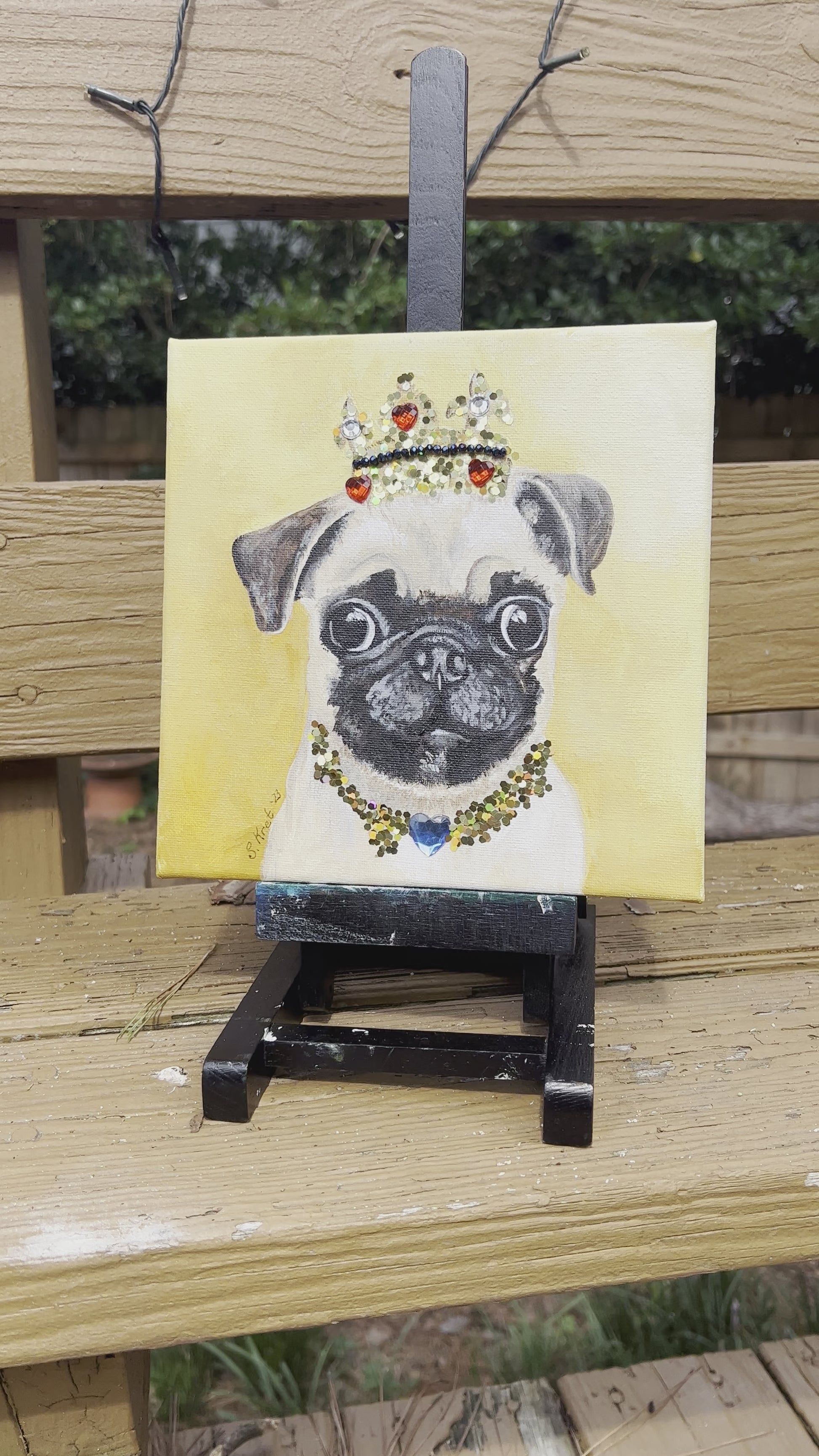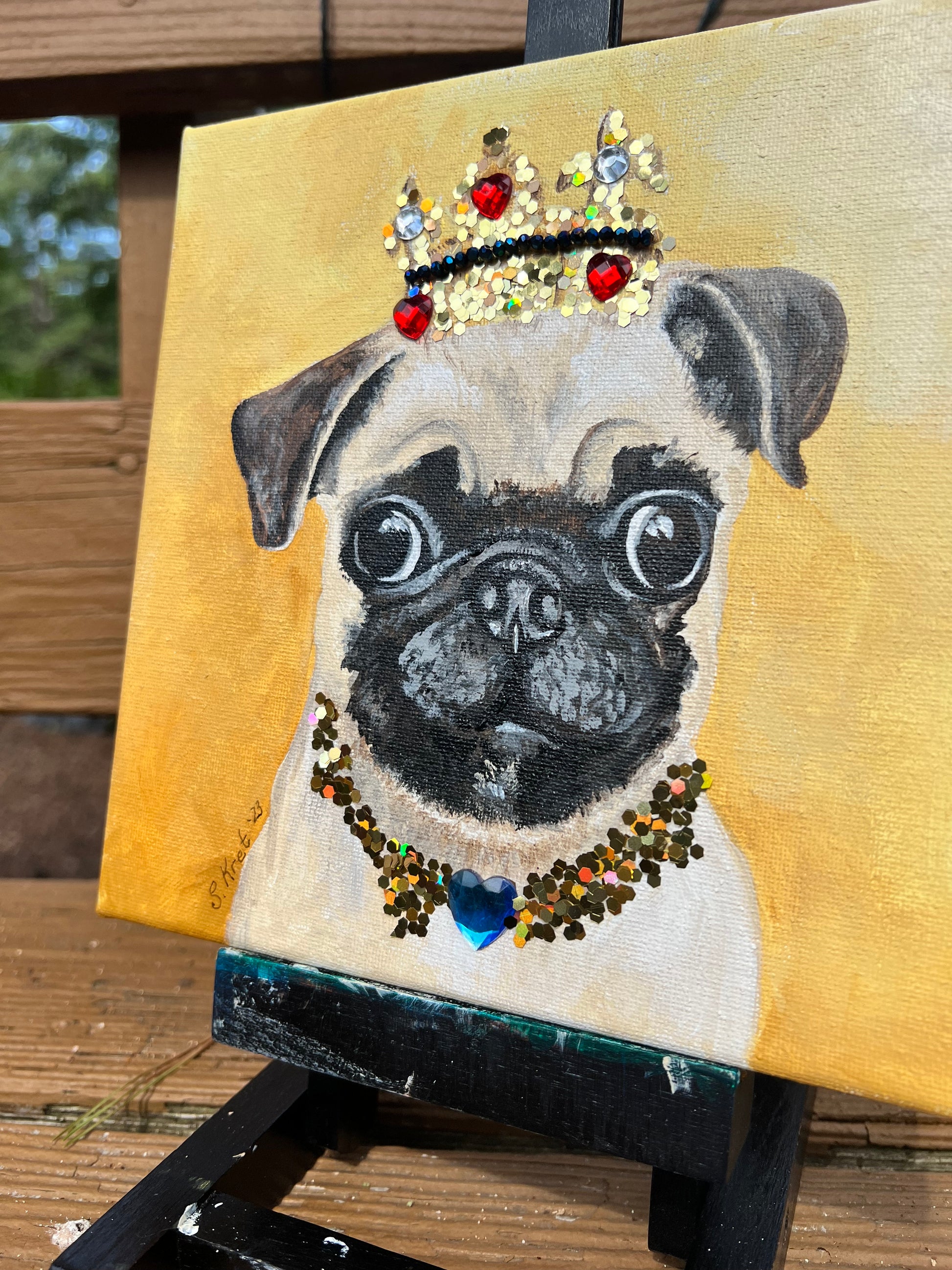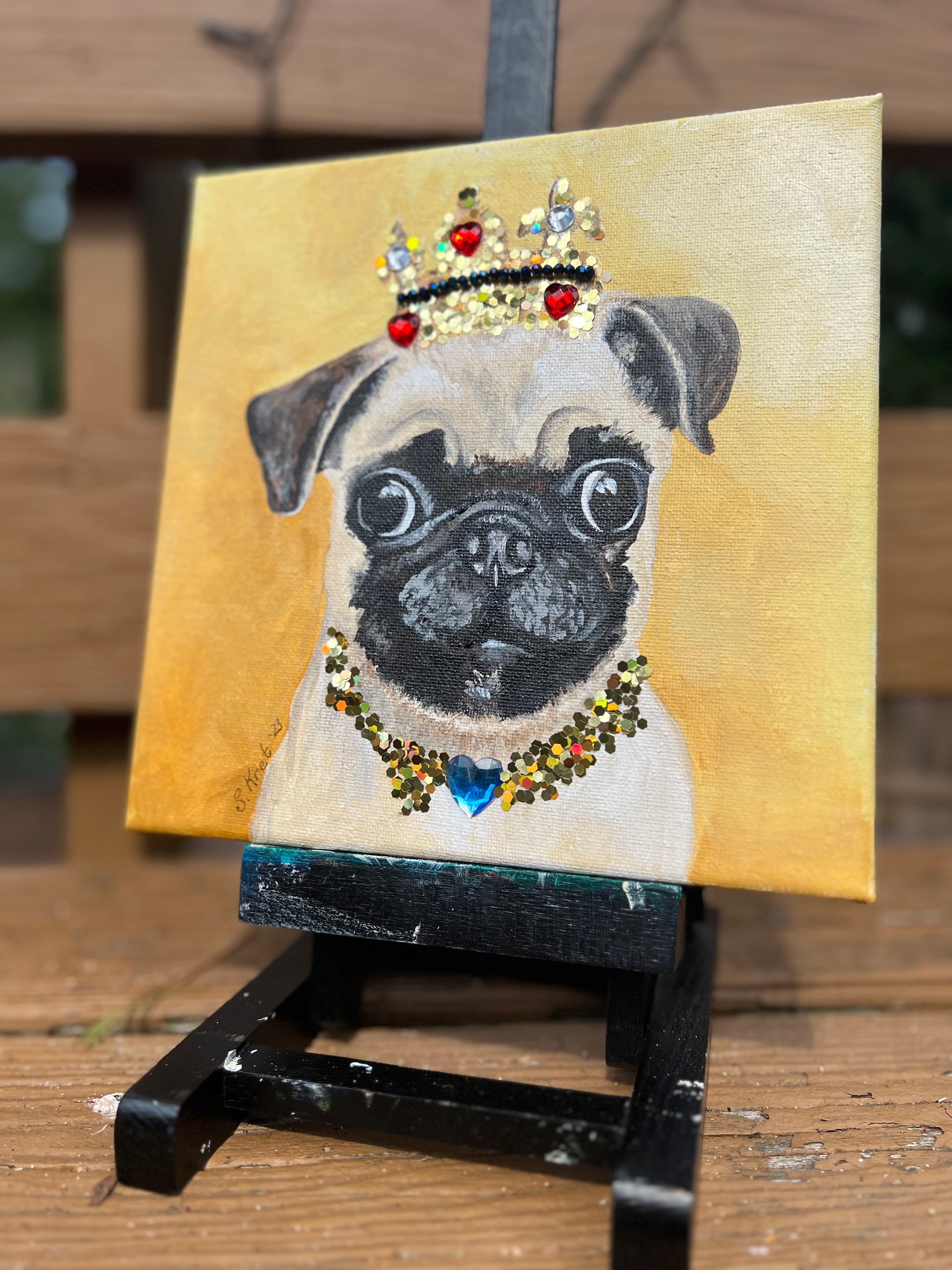 This striking one of a kind acrylic painting of a regal pug pup will make you feel like royalty! Featuring a prince or princess pug with a glittery crown and jewel necklace, it will be sure to crown your space with an air of royalty. Let this pup take your home decor game to the next level!